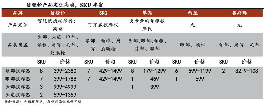 經(jīng)典案例:根據(jù)天貓旗艦店、東亞前海證券研究所等綜合資訊表明,目前倍輕松公司主要產(chǎn)品覆蓋 眼部、頸部、頭部、頭皮等主流部位,其他部位也有產(chǎn)品銷售,2021年其還新推出了智能艾灸盒產(chǎn)品“姜小竹 A1”,產(chǎn)品布局進一步延伸至中醫(yī)個護。每一個核心品類均有多個 SKU,滿足消費者多元化消費需求。如眼部按摩器有氣壓按摩式、機械按摩式和虛擬觸感按摩式三種類型等。