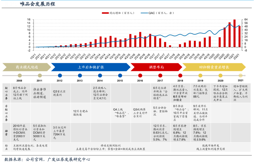 經(jīng)典案例:根據(jù)公司財(cái)報(bào)、廣發(fā)證券發(fā)展研究中心等綜合資訊表明,唯品會(huì)發(fā)展大致可以分為四個(gè)階段:品牌特賣模式逐漸跑通→上市后加快擴(kuò)張→調(diào) 整精簡(jiǎn)布局→回歸特賣用戶重啟增長(zhǎng);在不斷的探索調(diào)整中,唯品會(huì)提煉出“品牌 特賣”的核心能力。