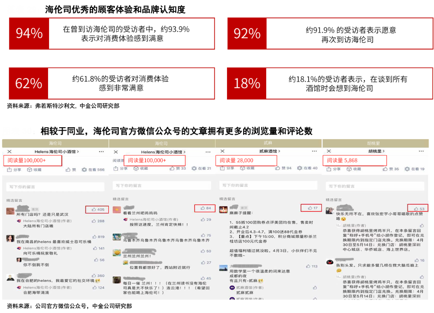 經(jīng)典案例:根據(jù)弗若斯特沙利文、公司官方微信公眾號(hào)、中金公司研究部等綜合資訊表明,在 2020 年 12 月進(jìn)行的消費(fèi)者調(diào)查,海倫司在所有酒館中,品牌知名度排名第一,約有18.1%受訪者在談到酒館時(shí)會(huì)想到海倫司。在曾到訪海倫司酒館的受訪者中,約93.9%對(duì)消費(fèi)體驗(yàn)表示滿意,其中約有61.8%的受訪者對(duì)消費(fèi)體 驗(yàn)非常滿意,約91.9%的受訪者表示會(huì)再次到訪海倫司。