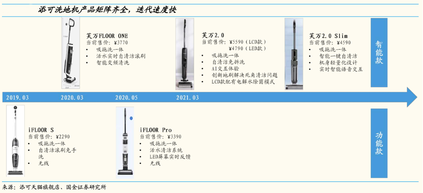 經典案例:根據添可天貓旗艦店、國金證券研究所等綜合資訊表明,除添可和必勝外,目前各個洗地機品牌機型相對有限,多數僅有 1-2 款。添可在洗地機主流價格 段 2500-3999 元擁有六款產品,包括智能款和功能款,可以滿足消費者不同層次的需求。此外,添可產品推新速度快,2021 年 3 月在旗艦款芙萬 1.0 的基礎 上升級 2.0,包括 LCD 和 LED 兩個版本,從水箱容量、死角清潔、殺菌等多個角度進一步優化產品設計。