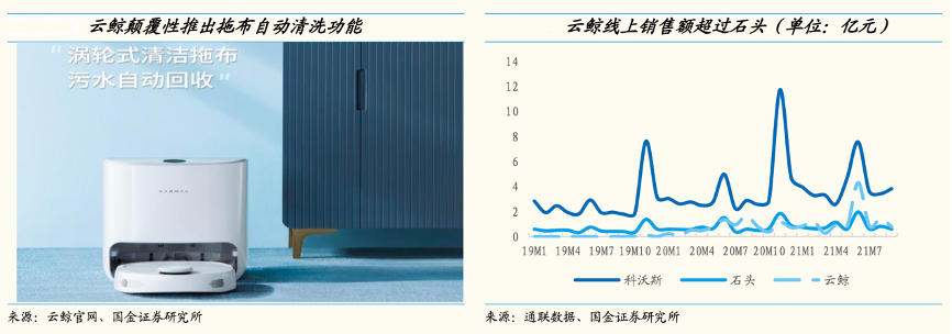 經(jīng)典案例:根據(jù)云鯨官網(wǎng)、通聯(lián)數(shù)據(jù)、國(guó)金證券研究所等綜合資訊表明,黑馬企業(yè)云鯨 2019 年推出行業(yè)內(nèi)第一款“能夠自動(dòng)洗拖布”的掃拖一體機(jī)器人,帶動(dòng)云鯨的市占率從 2019 年的 0.2%快速攀升至截至 2021 年 9 月的16.4%。云鯨僅憑 J1 一款產(chǎn)品即在行業(yè)中站穩(wěn)腳跟,超過(guò)石頭科技成為 掃地機(jī)器人市場(chǎng)線上銷售額市占率第二,根本原因在于“拖布自清潔”技術(shù)實(shí) 現(xiàn)了產(chǎn)品的差異化創(chuàng)新, 解決了機(jī)器人工作過(guò)后的手洗拖布問(wèn)題,進(jìn)一步解放了雙手。