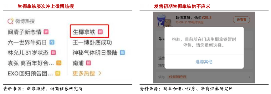 經(jīng)典案例:根據(jù)新浪微博、瑞幸咖啡小程序、浙商證券研究所等綜合資訊表明,新式咖啡采用桂花等果味糖漿、冷萃等新型技術(shù)以及巧克力、燕麥奶等新 型添加劑,口味新穎且更加吸引年輕人。例如,瑞幸于 2021 年夏天推出的生椰拿鐵便成為“爆款”,6 月單月銷量超過(guò) 1000 萬(wàn)杯。事實(shí)上,瑞幸自 2019 年以來(lái)每年都有“爆款”出現(xiàn),2019 年為隕石拿鐵,2020 年 為厚乳拿鐵,這些“爆款”都保留在產(chǎn)品線中,成為銷量主力。