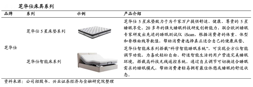 經(jīng)典案例:根據(jù)公司招股書、興業(yè)證券經(jīng)濟與金融研究院等綜合資訊表明,敏華控股公司依托于國內(nèi)外領(lǐng)先的沙發(fā)制造與銷售商地位,其芝華仕品牌旗下有 5 星床墊系列以及智能床 系列。其旗下 NICOLETTIHOME 尼科萊蒂以及名華軒品牌亦會提供相關(guān)的床具產(chǎn)品。