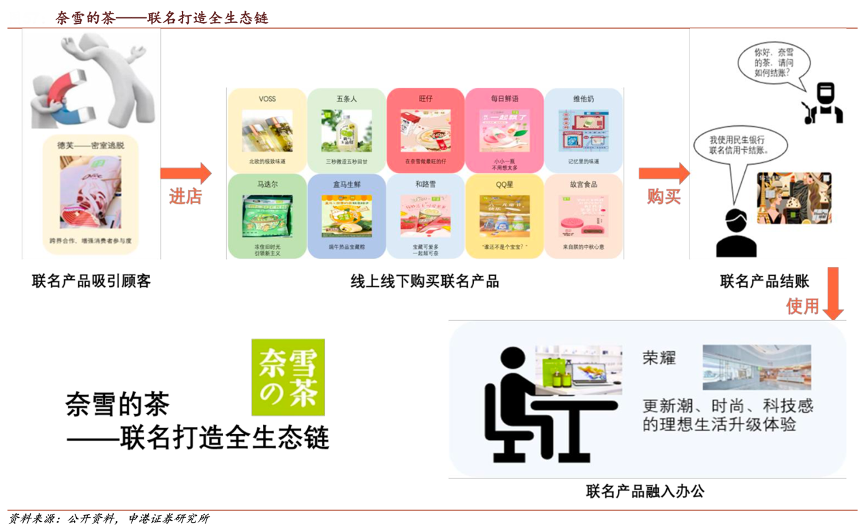 經典案例:根據公開資料、申港證券研究所等綜合資訊表明,奈雪與很多潮流生活方式品牌推出各種聯名活動,多維度跨界,體現其藝術感及個性化,與消費者進行精神互動。同時,奈雪的員工被鼓勵保持快樂,并將快樂的文化及積極向上的氛圍傳遞給客戶。