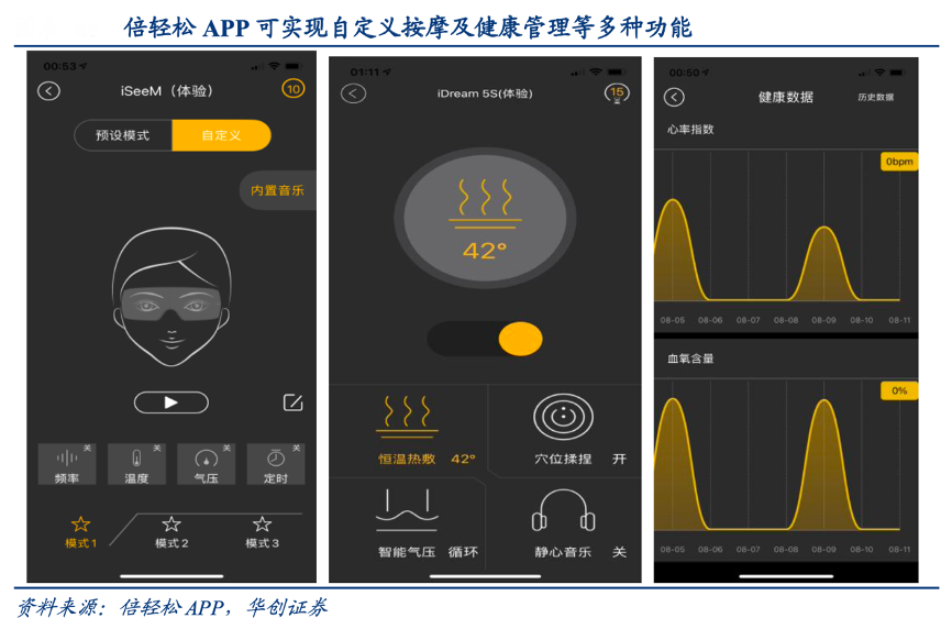 經典案例:根據倍輕松APP、華創證券等綜合資訊表明,倍輕松用戶可通過手機等移動終端設備與按摩器相連接,監測和管理個人健康狀況,并進行溫度調節、按摩程式設計等自定義設置,同時還能 DIY 按摩組合。同時其在大數據分析的輔助下為用戶提供更豐富的健康服務,如遠程推送更適合的按摩程式。但當前該技術研發應用有限,除倍輕松 APP 外其他技術仍處研發階段。
