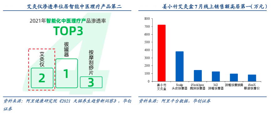 經典案例:根據阿里健康研究院、阿里平臺數據、華創證券等綜合資訊表明,除眼部、頸部、頭部等現有主流產品外,倍輕松公司還在積極拓展新的產品矩陣以觸達更多消費人群。根據阿里健康研究院的數據顯示,在智能化中醫醫療產品中艾灸儀的滲透率高居第二,而倍輕松推出的“智能艾灸盒”采用真明火懸灸,燃燒釋放的有益微量元素可被人體吸收,7月銷售額達到 717.8 萬元,超過第二名約90%,位居公司 SKU 線上收入之首。