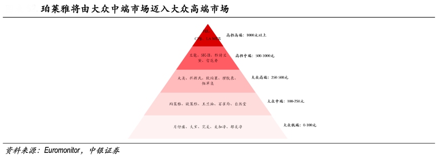 經(jīng)典案例:根據(jù)Euromonitor、中銀證券等綜合資訊表明,珀萊雅公司憑借其自身的強(qiáng)產(chǎn)品力和營銷力,進(jìn)一步推動“珀萊雅”品牌升級計劃,欲吸引更多一二線年輕消費群,升級消費者層次: “珀萊雅”品牌將嘗試300元以上的主推單品,以實現(xiàn)單價逐漸升級,由大眾中端邁入大眾高端品牌。而國有品牌大多主打大眾中低端,“珀萊雅”有望拉開與該類品牌之間的差距,提升市占率。