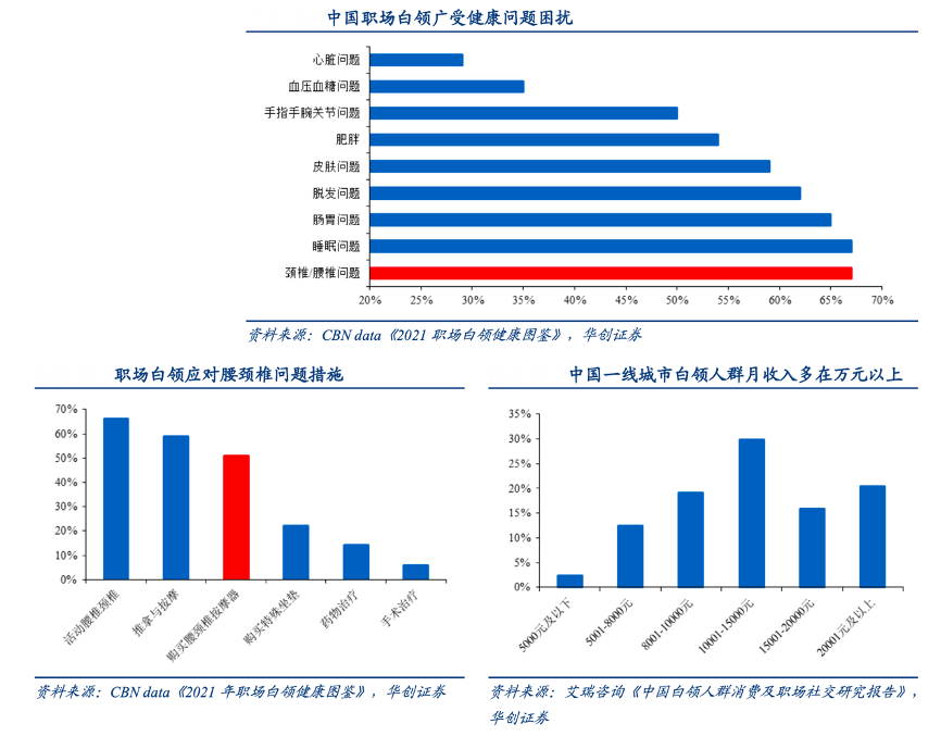 經典案例:根據CBN data《2021年職場白領健康圖鑒》、華創證券、艾瑞咨詢《中國白領人群消費及職場社交研究報告》等綜合資訊表明,在白領中腰椎/頸椎問題最為常見,比重達到 67%,是與睡眠問題并列的最普遍職場健康問題。