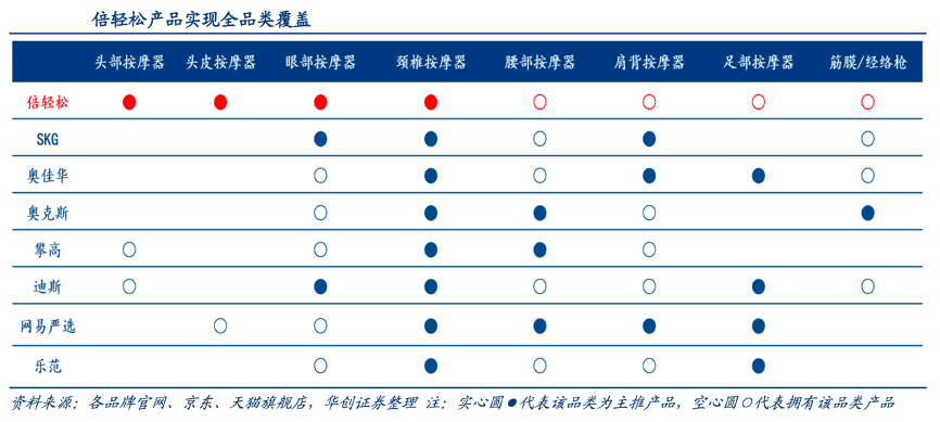 經典案例:根據各品牌官網、京東、天貓旗艦店、華創證券等綜合資訊表明,基于此前統計,眼部、頸椎等按摩產品為主要需求及當下主要規模品類,各類企業均有布局。在此基礎上,倍輕松在深耕眼部、頸部等主流按摩器具的基礎上,實現了對小型按摩器品類的全覆蓋,將有助于其市占率的持續提升。