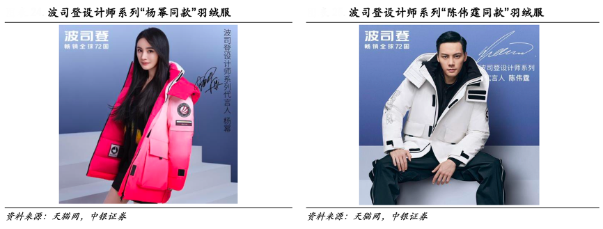 經典案例:根據天貓網、中銀證券等綜合資訊表明,2018年,波司登公司啟動全新戰略“聚焦主品牌”,攜手意大利設計師法比奧在水立方舉辦走秀,發布品牌戰略、“暢銷全球 72 國”品牌標識與門店形象,為品牌重塑發聲。波司登設計師系列產品邀請楊冪、陳偉霆作為代言人,以“明星同款”撬動粉絲經濟紅利,推廣品牌的同時提升產品銷量。