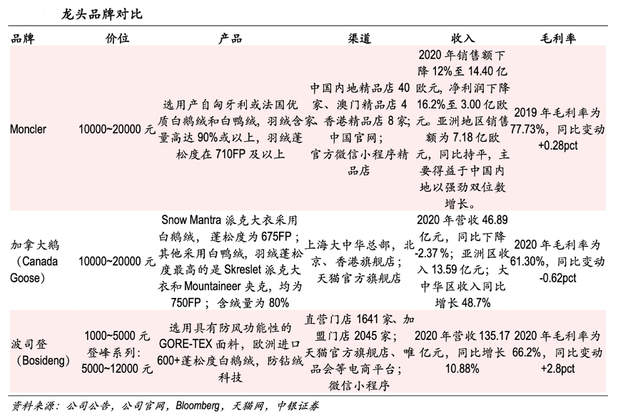 經典案例:根據公司公告、公司官網、Bloomberg、天貓網、中銀證券等綜合資訊表明,國際品牌將高端產品帶入中國羽絨服市場,刺激了中國市場對羽絨服時尚化與功能性的需求。時尚設計層面,Moncler 邀請天才設計師、注重大牌 聯名打造冬季潮流,加拿大鵝以美觀的派克大衣款式得到包括眾多明星在內的消費者的喜愛。龍頭品牌羽絨蓬松度均在 600 以上,Moncler、波司登選擇同一家瑞士藍標認證羽絨供應商的優質羽絨。波司登緊跟國際品牌腳步發展設計師聯名款,研發“登峰系列”提高蓬松度達 1000+、含絨量為極限 95%,與國際品牌比肩,繼續向中高端羽絨服品牌滲透。