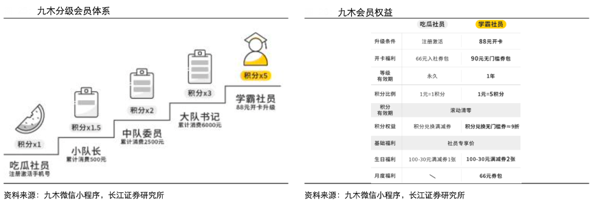 經(jīng)典案例:根據(jù)九木微信小程序、長江證券研究所等綜合資訊表明,2018年九木上線會員系統(tǒng),通過 APP 賦能一線導購管理會員資產(chǎn),提升消費者的購物體驗。九木分級會員體系基于累計消費額給予會員不同的等級,消費者通過手機號注冊激活即可成為吃瓜會員,并通過累計消費額的提升逐漸成為小隊長、中隊委員、大隊書記等,等級名稱喚醒客群的青春回憶,拉近品牌與消費者之間的距離,不同等級會員享受不同的消費累計積分倍數(shù)。