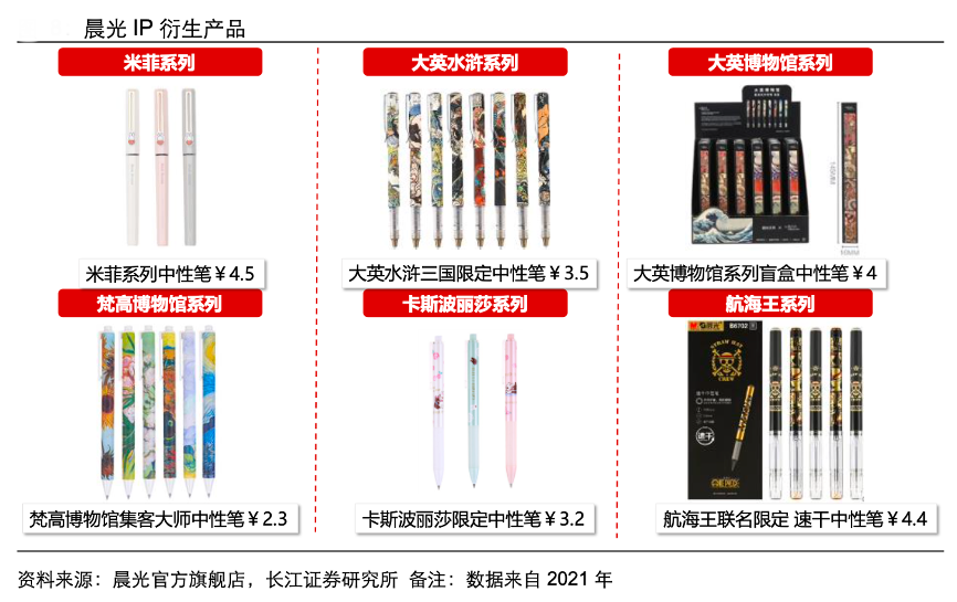 經(jīng)典案例:根據(jù)晨光官方旗艦店、長江證券研究所等綜合資訊表明,晨光豐富 IP 資源使產(chǎn)品更美觀:旗下 IP 包括米菲、Nanci、大英博物館等 10 大 IP,其中大英博物館旗下又包括水滸豪杰、水滸三國、愛麗絲等多個子IP,而其他品牌設計相對簡單。