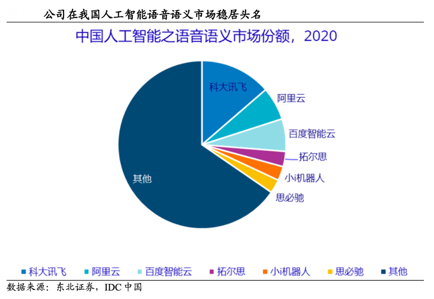 經典案例:根據東北證券、IDC中國等綜合資訊表明,科大訊飛公司深耕語音識 別領域,處于世界領先水平,在多個世界專業比賽內取得冠軍。根據 IDC 發布的 《中國人工智能軟件及應用市場研究報告-2020》顯示,其在中國人工智能語音 語義市場穩居頭名。相比于綜合性人工智能開放平臺,其在語音識別、語音合成等垂直領域具有相對技術優勢和豐富應用經驗,形成一定競爭壁壘。