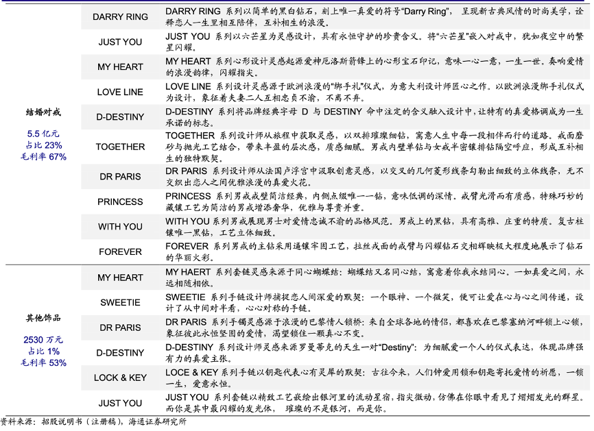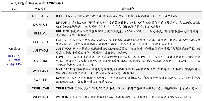 經典案例:根據公司招股說明書(注冊稿)、海通證券研究所等綜合資訊表明,DR公司主要產品為求婚鉆戒、結婚對戒及其他飾品,各類目均有若干代表性系列產品。從收入占比看,主力產品類型為求婚鉆戒與結婚對戒,2018-1H21 收入合計占比為 98.22%、98.42%、98.97%、98.32%,收入占比較為穩定。