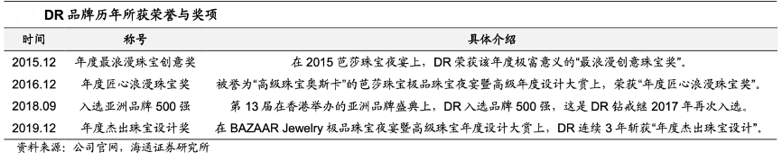 經典案例:根據公司官網、海通證券研究所等綜合資訊表明,從 DR 品牌創立之初,其即堅持“男士一生僅能定制一枚”DR 求婚鉆戒,持續向 消費者傳達 DR 品牌“一生〃唯一〃真愛”的愛情觀。其賦予DR求婚鉆戒的愛情態度不僅滿足了消費者對珠寶飾品的審美需求,更滿足了消費者對專一愛情的情感需求,使得消費者購買 DR 求婚鉆戒的行為不僅僅代表著自己的審美取向,更傳達出自己對“一生一世、一心一意”的愛情追求。