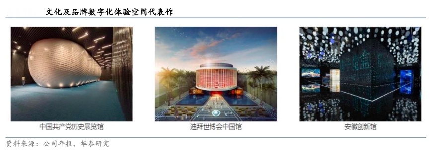 經(jīng)典案例:根據(jù)公司年報、華泰研究等綜合資訊表明,風(fēng)語筑公司的“文化及品牌數(shù)字化體驗空間”業(yè)務(wù)主要面向社會大眾和消費者,具有較強文化宣傳屬性。通過創(chuàng)意設(shè)計、互動技術(shù)、沉浸式體驗和數(shù)字藝術(shù)等方式,以主題館、博物館、旅游體驗館、科技館、企業(yè)館、紀(jì)念館、市民文化中心、產(chǎn)業(yè)展示中心和特色小鎮(zhèn)等新型互動式體驗空間為載體,深度融合 IP 主題和時尚藝術(shù)潮流,展現(xiàn)不同的地方文化特色和品牌形象。