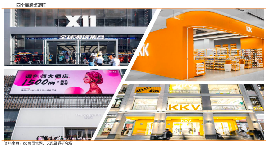 經(jīng)典案例:根據(jù)KK集團(tuán)官網(wǎng)、天風(fēng)證券研究所等綜合資訊表明,KK公司專注于潮流零售店的運(yùn)營,通過 DTC 模式向終端消費(fèi)者提供各具特色的商品。商品橫跨美妝、潮玩、食品飲料、家居日用、文具等主要核心生活用品的 18 個(gè)主要品類,潮流單品 SKU 超 20000。過去幾年集團(tuán)品牌矩陣不斷拓展,當(dāng)前主要經(jīng)營四個(gè)潮流零售品牌,「KK 館」、「KKV」、「THE COLORIST 調(diào)色師」和「X11」,旨在滿足國內(nèi)消費(fèi)者的不同市場需求。如“KK館”品牌定位為生活方式迷你賣場,為消費(fèi)者提供契合生活日用場景的各種國內(nèi)和進(jìn)口的多元品類商品。