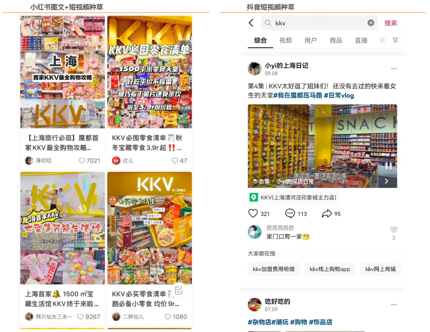 經(jīng)典案例:根據(jù)小紅書APP、抖音APP、天風(fēng)證券研究所等綜合資訊表明,KKV通過“紅人營銷+新媒體營銷”,打造線上種草線下拔草新消費(fèi)閉環(huán)。承載短視頻、圖文的如抖音、小紅書等內(nèi)容平臺帶火了新式營銷方法,核心優(yōu)勢類目著重 KOL/KOC 投放,通過線上分享消費(fèi)體驗(yàn),引發(fā)社區(qū)互動(dòng),并推動(dòng)其他用戶線下消費(fèi)買單。