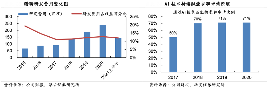 經典案例:根據公司財報、華安證券研究所等綜合資訊表明,獵聘作為互聯網招聘平臺的最大優勢在于大量數據的自動生成,實時有效的大數據能供幫助平臺迭代智能化推薦與匹配算法,從而實現優質用戶數量增長與高質量數據不斷更新的良性循環。數據顯示,其研發投入一直保持在較高水平,主要用于創新升級產品與合并收購公司系統,2020年,獵聘公司研發費用為 2.4 億元,占營業收入比重為12.8%。