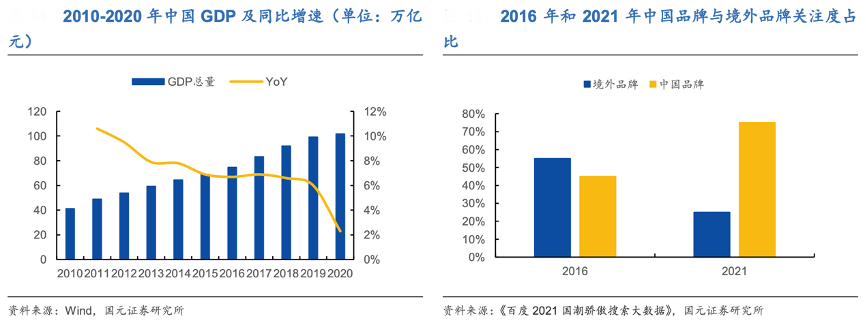 經(jīng)典案例:根據(jù)wind、《百度2021國潮驕傲搜索大數(shù)據(jù)》、國元證券研究所等綜合資訊表明,相較于以往的高價外國品牌,人們開始更偏好貼合本國人民消費需求和心理,并且具有性價比的本土品牌,本土文化自信增強,以拼多多為平臺承載的大量小眾品牌開始崛起,主打國潮文化的產(chǎn)品大受歡迎。消費者不僅消費產(chǎn)品本身,更加注重其附帶的品牌價值、個性標(biāo)簽、情感呼應(yīng)以及購物流程、環(huán)境與服務(wù)等實際購物體驗。