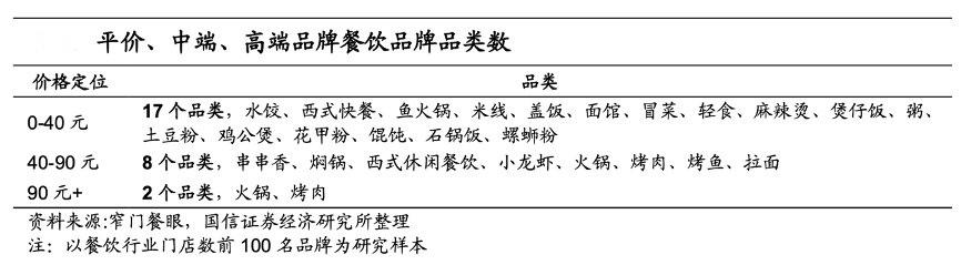 經典案例:根據窄門睜眼、國信證券經濟研究所等綜合資訊表明,以中國餐飲行業門店規模前 100 名品牌為例,平價(0-40 元)、中端(40-90 元)、高端(>90 元)三類門店數占比分別為 76%、17%、7%,以品牌價格定位為縱軸,餐飲行 業市場結構呈現正金字塔形,從門店規模角度而言,即平價餐飲>中端餐飲>高 端定位餐飲市場規模。同時三個價格定位帶品類也呈現遞減趨勢,76 個平價(快 餐)品牌中共有 17 個細分品類,涵蓋西式快餐(漢堡/薯條/披薩)、拉面、蓋飯、黃燜雞、米線、麻辣燙等品類。
