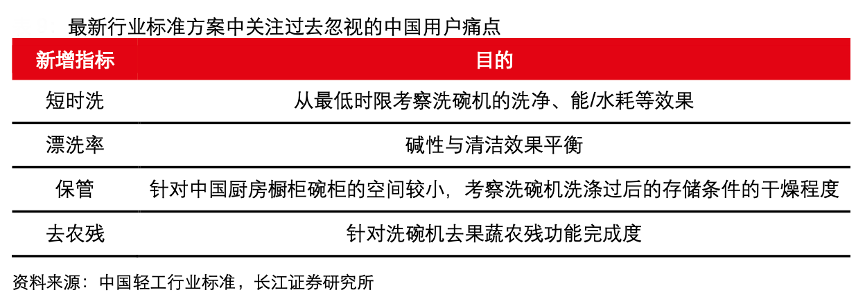 經(jīng)典案例:根據(jù)中國(guó)輕工行業(yè)標(biāo)準(zhǔn)、長(zhǎng)江證券研究所等綜合資訊表明,2021年洗碗機(jī)相關(guān)的行業(yè)標(biāo)準(zhǔn)再次升級(jí),從目前的提案看,新修訂方案除了在潔凈指數(shù)、干燥指數(shù)、能源效率指數(shù)、水效率指數(shù)上較 2013 年 QB/T1520-2013 大幅提 高了標(biāo)準(zhǔn),還針對(duì)過(guò)去用戶忽視的痛點(diǎn)新增相關(guān)指標(biāo),包括短時(shí)洗、漂洗率、保管、去 弄?dú)埖取狳c(diǎn)賣點(diǎn)集中推出,疊加行業(yè)標(biāo)準(zhǔn)的提升與深入,將為洗碗機(jī)市場(chǎng)注入新的驅(qū)動(dòng)力。
