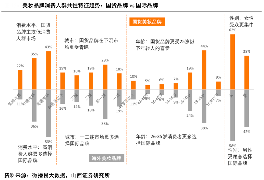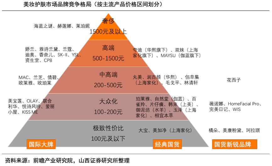 經典案例:根據前瞻產業研究院、山西證券研究所等綜合資訊表明,分品牌看,國際品牌在奢侈到大眾化四個階層中均有布局,而國貨品牌絕大多數分布在中高端和大眾化階層。借助直播、短視頻等新媒體渠道,老牌本土品牌重新煥發活力的同時,新銳國貨品牌表現亮眼,并且部分品牌通過兼并收購等方式拓寬品牌矩陣、掘金中高端市場。