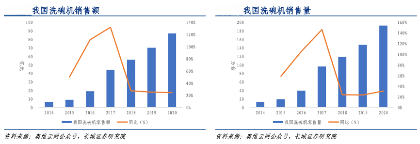 經典案例:根據奧維云網公眾號、長城證券研究院等綜合資訊表明,針對國內市場油污殘留、費水費電、適用廚具有限等一系列痛點,國產洗碗機將清洗原理升級至“高壓+高溫+洗滌劑”噴淋并集成消毒功能提升清潔力度,通過循環用水實現節水,以及擴大容量實現洗鍋需求。需求端的剛性結合供給端功能積極補足,賦予洗碗機行業市場規模成長活力。根據奧維云網公眾號統計,2020 年我國洗碗機零售額為 87 億元,同比增長 24%,2015-2020 年連續五年復合增長率高達 57%;2020 年我國洗碗機零售量為 192 萬臺,同比增長 31%, 2015-2020 年連續五年復合增長率高達 59%。