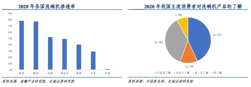 經典案例:根據前瞻產業研究院、中國家電網、長城證券研究院等綜合資訊表明,目前我國洗碗機市場仍處導入期,滲透率與各國差距較大,對比 2020 年各國洗碗機滲透率,根據前瞻產業研究院統計,我國洗碗機滲透率僅1%,與歐美成熟市場50%-80%的水平差距巨大。滲透程度較低的原因或為認知不足而非飲食習慣差異,一方面根據中國家電網《2020 年中國洗碗機市場發展白皮書》對主流消費者的調查,對洗碗機不是很了解或完全不了解的消費者占比達 55.52%;另一方面與我國飲食習慣相對接近的日本滲透率已達到 29%,飲食結構影響因素或較弱,隨著我國消費者認知更新,我國洗碗機市場存在龐大增長潛力。
