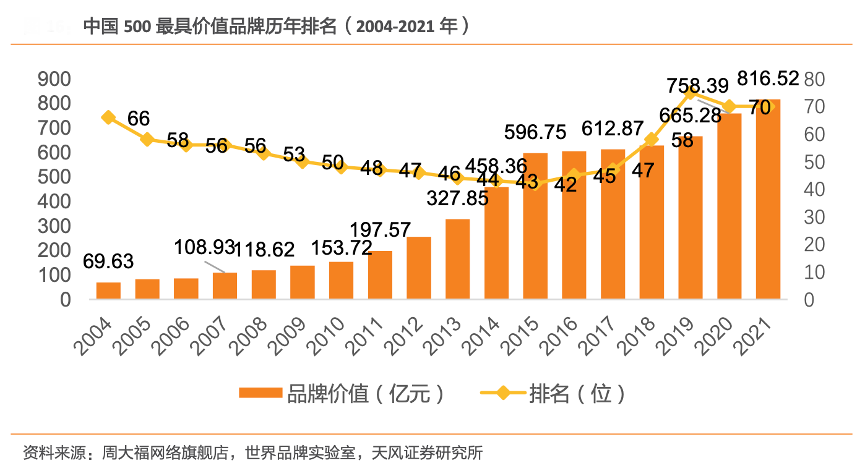 經(jīng)典案例:根據(jù)周大福網(wǎng)絡(luò)旗艦店、世界品牌實(shí)驗(yàn)室、天風(fēng)證券研究所等綜合資訊表明,周大福公司發(fā)展至今92 年,2011年獲得香港驕傲企業(yè)品牌選舉 2011-珠寶、首飾零售類別獎(jiǎng)項(xiàng),2016 年周大福獲得世界品牌 500 強(qiáng)、世界 品牌大獎(jiǎng),此后又連續(xù)多年獲得該獎(jiǎng)項(xiàng)。2020 年公司獲得 Brand Finance 全球 500 最具價(jià) 值品牌,2020年亞洲最具影響力品牌-高級珠寶類-最值得信賴品牌,2021 年獲得福布斯全球上公司 2000 強(qiáng),充分體現(xiàn)了公司廣受認(rèn)可的強(qiáng)大品牌力。
