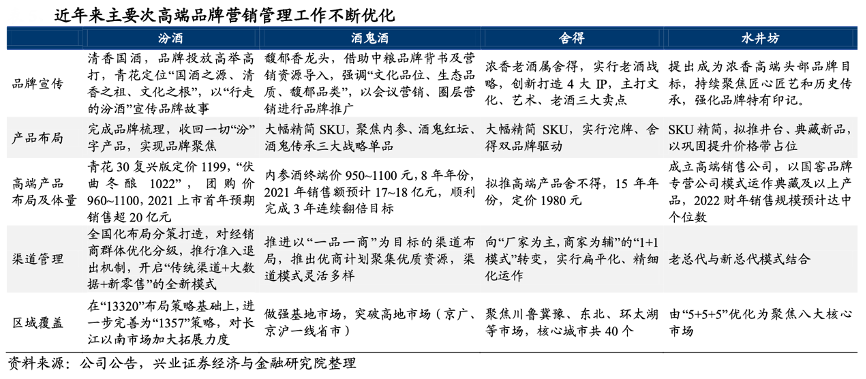 經典案例:根據公司公告、興業證券經濟與金融研究院等綜合資訊表明,2018年以來,主要次高端酒企在品牌營銷、產品布局、渠道精細化運作等方面均有加強,并且更加注重消費者培育,動銷氛圍穩步提升,核心市場數量/規模持續 增長。