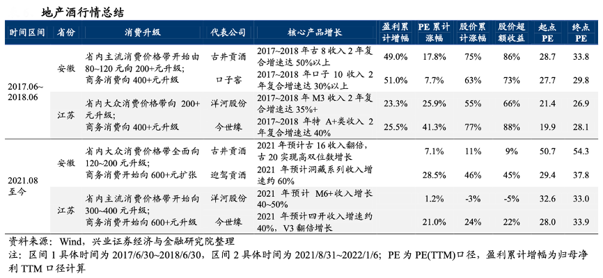 經典案例:根據wind、興業證券經濟與金融研究院等綜合資訊表明,目前區域龍頭重新步入產品結構加速升級階段,迎駕洞藏、今世緣四開實現放量 增長,古井、洋河則在省內 600~800 元超次高端價格帶成功建立規模優勢,進一步構筑品牌壁壘。參考 2017~2018 年周期時長,預計地產酒景氣在 2022 年仍將延 續,在 2020-2021 地產酒結構升級主線仍然鮮明突出。