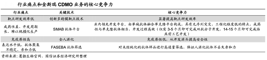 經(jīng)典案例:根據(jù)蓬勃生物官網(wǎng)、國信證券經(jīng)濟(jì)研究所等綜合資訊表明,金斯瑞 CDMO 業(yè)務(wù)具有 4 項(xiàng)關(guān)鍵技術(shù),能夠顯著提高核心競(jìng)爭(zhēng)力。現(xiàn)有抗體開發(fā)技術(shù)有靶點(diǎn)研發(fā)效率低、成藥性差、開發(fā)周期長(zhǎng)、難以規(guī)模化生產(chǎn)、免疫原性高、表達(dá)水平低、抗體聚集、親和力低等缺點(diǎn)。其針對(duì)這些行業(yè)痛點(diǎn),開發(fā)創(chuàng)新多跨膜靶點(diǎn)技術(shù)、SMAB 抗體平臺(tái)、全人源化、FASEBA 抗體篩選等關(guān)鍵技術(shù),提高了靶點(diǎn)研發(fā)效率、成藥性和安全性,具有核心競(jìng)爭(zhēng)力。