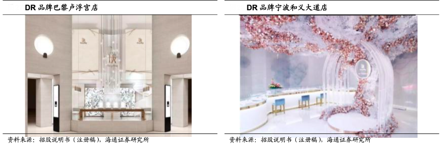 經典案例:根據公司招股說明書(注冊稿)、海通證券研究所等綜合資訊表明,為了給消費者提供更好的消費體驗并提高品牌曝光度,DR公司不斷加強線下渠道的建設。其線下門店不僅是消費者挑選購買珠寶產品的場所,還可以為消費者提供求婚場地布臵等服務。其在部分核心城市打造了數家真愛體驗旗艦店,通過店鋪氛圍營造、陳列細節設計、設設計求婚表白專用區域等方式,為消費者提供了具有 DR 特色的真愛購物體驗。