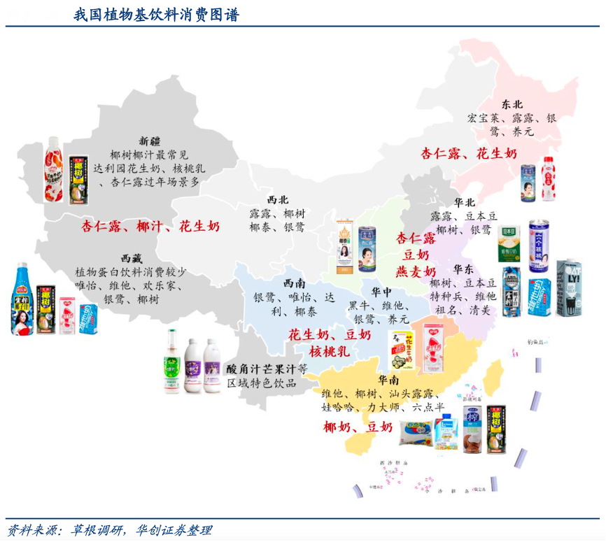 經典案例:根據草根調研、華創證券等綜合資訊表明,植物基飲料從品類分布到品牌擴張,均存在一定地域性。西北地區牧場遍布奶源豐富,極少喝豆奶。而南方極少喝杏仁露,北方在過年禮贈、餐飲較常見;泛全國化品類主要包括核桃露、花生奶、椰汁。品類分布基礎上,品牌區域割據同樣明顯,“西唯怡、東銀鷺、南椰樹,北露露”是早期行業品牌割據的生動寫照。