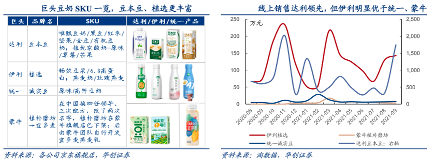 經典案例:根據各公司京東旗艦店、淘數據、華創證券等綜合資訊表明,達利公司自 2017 年推出豆本豆豆奶,聚焦早餐場景,并于 2019 年明確產品定位為“專注植物營養”,當前豆本豆豆奶已形成了涵蓋 2-6 元各種規格口味的產品,產品矩陣已較為完善。憑借品牌高舉高打及渠道優勢,豆本豆占行業份額達 10%,已在豆奶第一陣營,并于 2021 年首創常溫植物酸奶,對標常溫酸奶安慕希,進一步擴展產品矩陣,深度卡位植物基賽道。