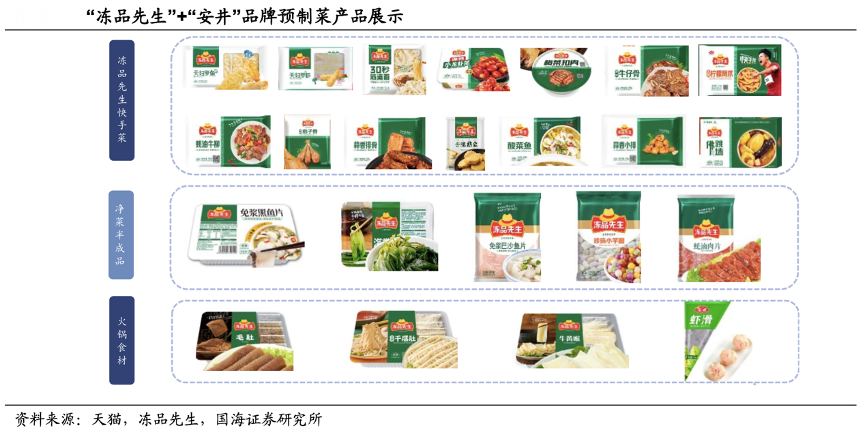 經典案例:根據天貓、凍品先生、國海證券研究所等綜合資訊表明,安井食品 公司是速凍食品行業龍頭,2020 年收入和歸母凈利潤分別為 69.96 億元和 6.04 億元。主要產品包括速凍魚糜制品、速凍肉制品、速凍面米制品以及菜肴制品。其于2018年H2推出子品牌“凍品先生”,前期定位餐飲食材產品,采取輕資產 OEM 運營模式,截止2021年Q3,菜肴制品規模達到了9.2億元,同比增長126%,其中預計 2021 年預制菜產品收入達到 3 億元。