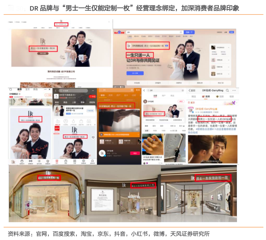 經典案例:根據官網、百度搜索、淘寶、京東、抖音、小紅書、微博、天風證券研究所等綜合資訊表明,搜索引擎、官網將DR品牌“男士一生僅能定制一枚”標語列在頁面中央,聚焦視線;天貓商城、京東自營店品牌形象一致,DR品牌標志與“男士一生僅能定制一枚”標語綁定出現,開通直播拉動銷量及回復消費者對于購買規則和線下售后疑問;線下門店招牌將品牌標志與“男士一生僅能定制一枚”并列展出,以經營理念詮釋品牌。