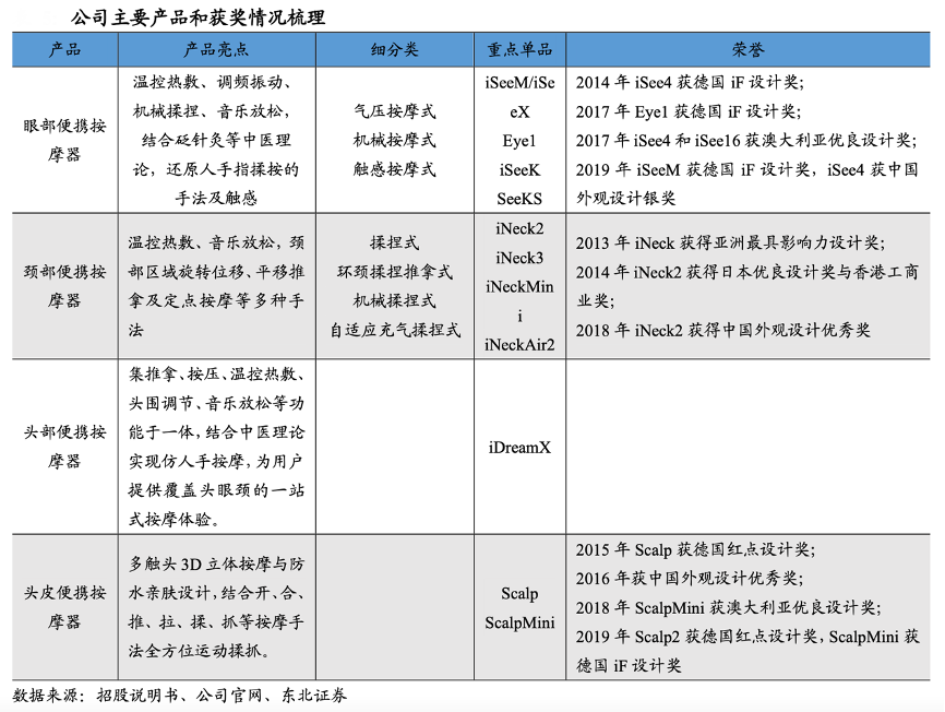經(jīng)典案例:根據(jù)招股說(shuō)明書、公司官網(wǎng)、東北證券等綜合資訊表明,倍輕松公司產(chǎn)品一方面通過(guò)“動(dòng)力+機(jī)械+材料+溫濕度”的結(jié)合,達(dá)到了最接近于真人的體驗(yàn);另一方面,產(chǎn)品的外觀設(shè)計(jì)持續(xù)迭代創(chuàng)新,主打“智能便攜”,旗下幾乎每個(gè)爆款產(chǎn)品均獲得過(guò)相關(guān)領(lǐng)域設(shè)計(jì)獎(jiǎng)項(xiàng),產(chǎn)品設(shè)計(jì)能力行業(yè)領(lǐng)先,高端品牌調(diào)性十足。