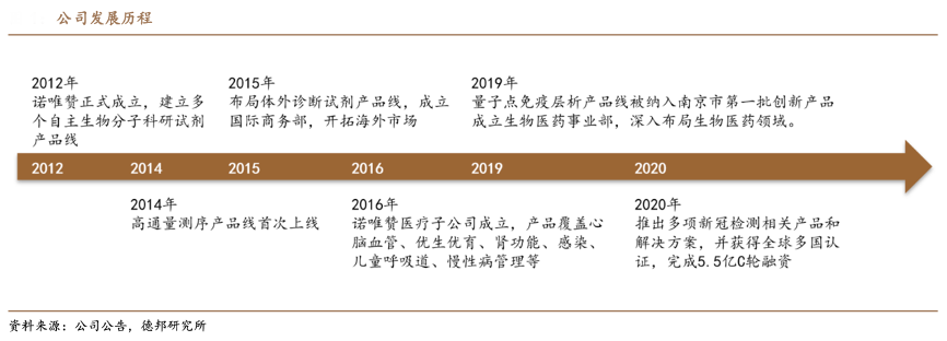 經典案例:根據(jù)公司公告、德邦研究所等綜合資訊表明,諾唯贊生物成立于 2012 年,業(yè)務覆蓋生物試劑、體外診斷和生物醫(yī)藥,是一家圍繞酶、抗原、抗體等功能性蛋白進行技術研發(fā)和產品開發(fā)的生物科技企業(yè),擁有 500 多個終端產品,可廣泛應用于科學研究、高通量測序、體外診斷、醫(yī)藥及疫苗研發(fā)和動物檢疫等領域,是國內少數(shù)同時具有自主可控上游技術開發(fā)能力和終端產品生產能力的研發(fā)創(chuàng)新型企業(yè)。
