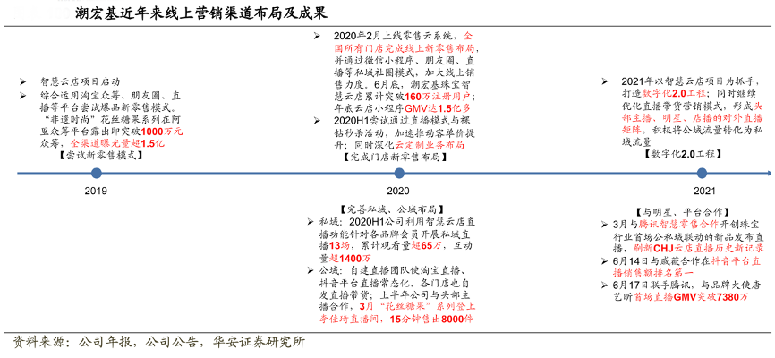 經(jīng)典案例:根據(jù)公司年報、公司公告、華安證券研究所等綜合資訊表明,自2019年智慧云店項目啟動,潮宏基數(shù)字化轉(zhuǎn)型不斷加速且效果顯著。2020年其全國所有門店完成線上新零售布局,同時公司公域、私域兩手抓,自建直播團隊,開展品牌會員私域直播。2021 年公司加速全渠道用戶生態(tài)系統(tǒng)建設(shè),打造數(shù)字化 2.0 工程,通 過大數(shù)據(jù)挖掘及探索,形成用戶資產(chǎn)的數(shù)字化及標(biāo)簽化管理,持續(xù)深化全天候全域的新零售商業(yè)模式。
