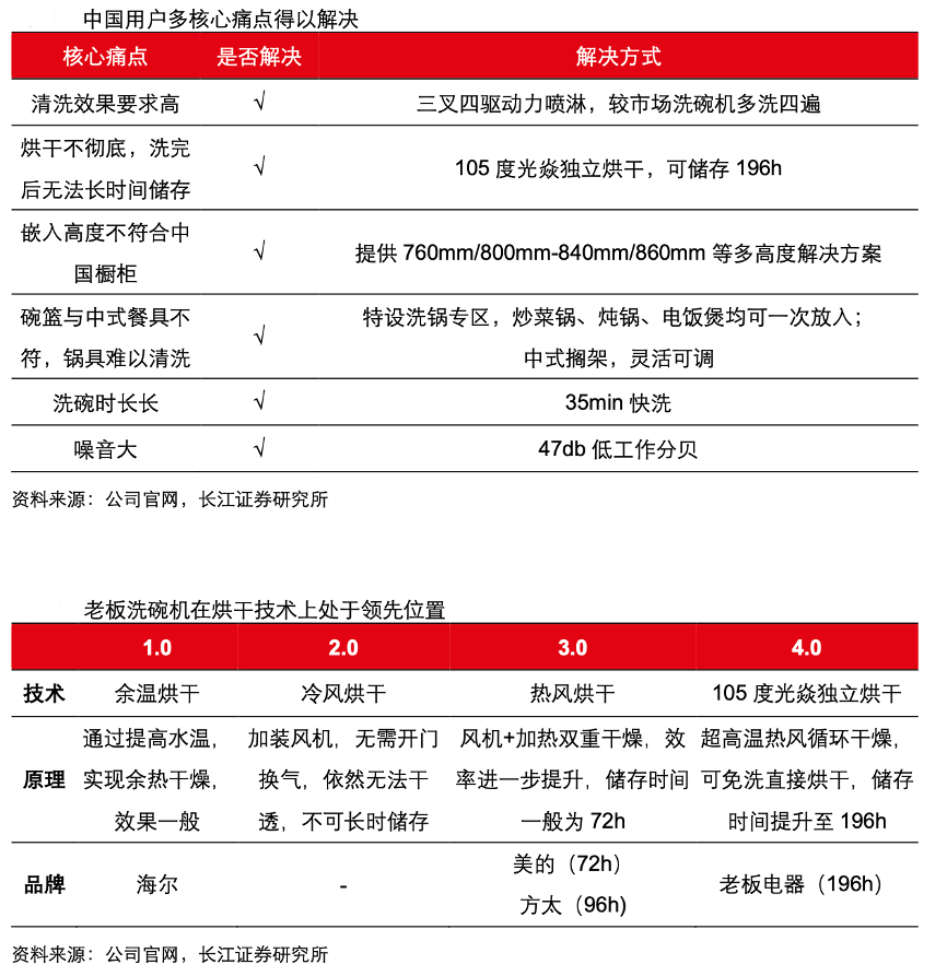經(jīng)典案例:根據(jù)公司官網(wǎng)、長(zhǎng)江證券研究所等綜合資訊表明,產(chǎn)品方面,老板電器通過(guò)深入研究中國(guó)廚房習(xí)慣,迭代升級(jí)強(qiáng)力清洗技術(shù),自主研發(fā)三叉洗凈專利,滿足中式烹飪過(guò)后餐具重油重污的潔凈需求;老板電器同時(shí)考慮了安裝便利問(wèn)題,確保可以靈活適配不同高度的中國(guó)廚房;值得一提的是,老板在烘干技術(shù)上處于絕對(duì)領(lǐng)先位置,可實(shí)現(xiàn)免洗直烘,且儲(chǔ)存時(shí)長(zhǎng)可達(dá)196h。