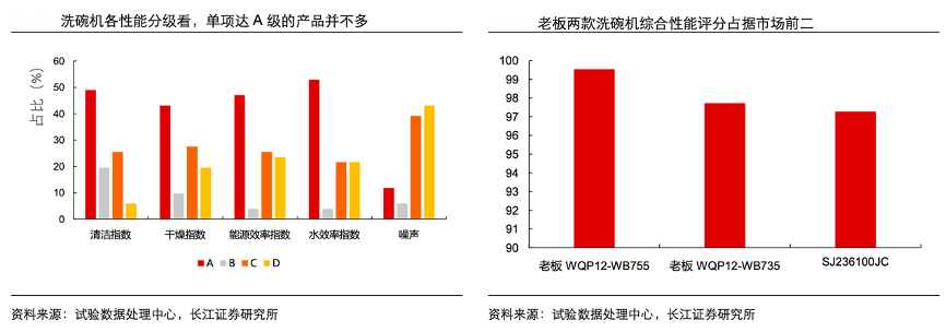 經(jīng)典案例:根據(jù)試驗(yàn)數(shù)據(jù)處理中心、長(zhǎng)江證券研究所等綜合資訊表明,在中國(guó)家用電器研究院實(shí)驗(yàn)數(shù)據(jù)處理中心對(duì) 2019 年 1 月至 2020 年 8 月統(tǒng)計(jì)的 101 份 洗碗機(jī)檢測(cè)報(bào)告的 600 多個(gè)實(shí)驗(yàn)數(shù)據(jù),在清潔指數(shù)、干燥指數(shù)、能源效率指數(shù)、水效率指數(shù) 4 項(xiàng)洗碗機(jī)性能指數(shù)上,能達(dá) A 級(jí)標(biāo)準(zhǔn)的產(chǎn)品占比在 43.1%至 52.9%之間,噪聲項(xiàng)目產(chǎn)品能達(dá) A 級(jí)比例的僅有 11.8%;而在眾多產(chǎn)品中,排名前三的洗碗機(jī)產(chǎn)品中兩款來(lái)自于老板電器。