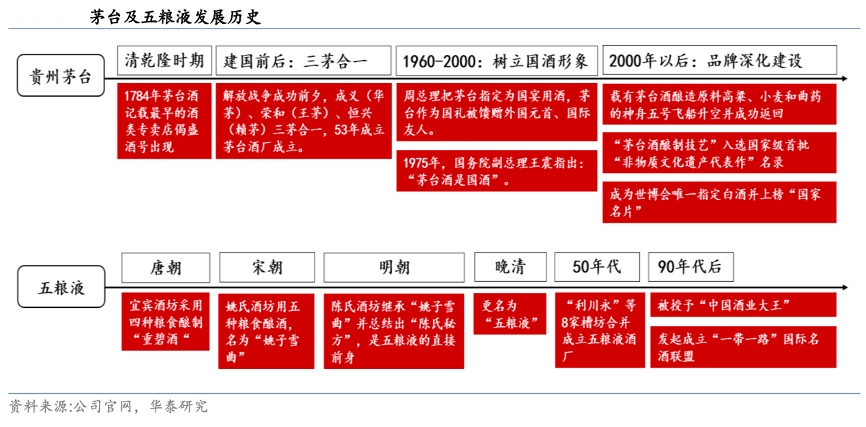 經(jīng)典案例:根據(jù)公司官網(wǎng)、華泰研究等綜合資訊表明,文化在歷史中沉淀且貫穿始終,以茅臺、五糧液兩大龍頭為例,其可考歷史均可追溯至建國前,口碑代代相傳,酒香與歷史相互縈繞,五糧液名字由來的五谷雜糧“陳氏秘方”、國窖 1573 的明朝萬歷年間的“國寶窖池”,茅臺與三渡赤水的紅軍結(jié)下不解之緣等等故事都使得品牌的歷史底蘊增厚,建國后在重要的外交及其他政商場所頻頻亮相,核心圈層加持賦予其高端形象,同歷史凝結(jié)成名酒氣質(zhì)。