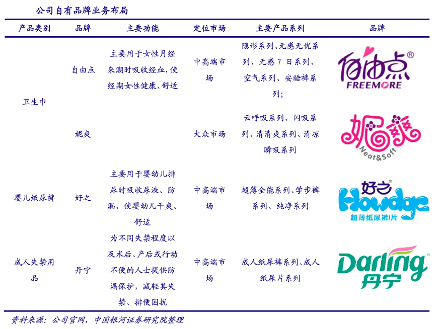 經(jīng)典案例:根據(jù)公司官網(wǎng)、中國銀河證券研究院等綜合資訊表明,百亞股份公司擁有的自有品牌產(chǎn)品包括衛(wèi)生巾、嬰兒紙尿褲、成人失禁用品,涵蓋中高端市場和 大眾市場。“自由點”、“妮爽”衛(wèi)生巾,分別定位于中高端市場和大眾市場,“自由點”品牌理 念為青春自由,包含有多個系列的產(chǎn)品,分別針對女性不同需求的場景,是公司目前的拳頭產(chǎn) 品。“妮爽”產(chǎn)品定位大眾市場,價格優(yōu)惠,滿足大眾女性的生理期需求。