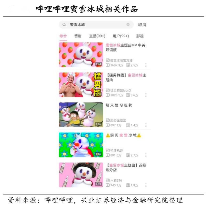 經典案例:根據嗶哩嗶哩、興業證券經濟與金融研究院等綜合資訊表明,蜜雪冰城設計了全球化的品牌諺語——“你愛我我愛你,蜜雪冰城甜蜜蜜”。2021 年 6 月, 蜜雪冰城主題曲 B 站播放量過千萬,更引起 B 站用戶的二創熱潮,加速雪王 IP 傳播,強化消費者的品牌認知。