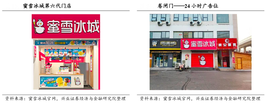 經典案例:根據蜜雪冰城官網、興業證券經濟與金融研究院等綜合資訊表明,蜜雪冰城第六代門店采用鮮艷醒目的玫紅主題色、大而浮夸的字體、高密度的海報和廣告牌,顏色的記憶成本遠低于文字成本、店招的粗細大小和亮度 影響品牌能見距離的遠近、卷閘門刷上超級符號則成為 24 小時的廣告位,這種設計對消費者形成視覺沖擊,鎖住顧客眼球。