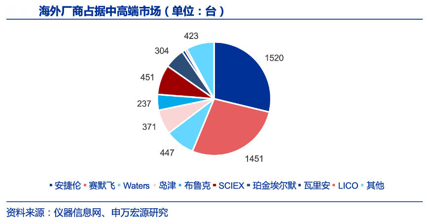 經(jīng)典案例:根據(jù)儀器信息網(wǎng)、申萬宏源研究等綜合資訊表明,結合其對全國單價 50 萬以上的質譜儀器調研顯示,在其統(tǒng)計的 5282 臺設備中,主要品牌為安捷倫、賽默飛、Waters、SCIEX、島 津等國際一流廠商,其占比之和達到90%以上。國內(nèi)中高端質譜儀市場被國際主流廠商占據(jù),國內(nèi)廠商國產(chǎn)替代空間大。