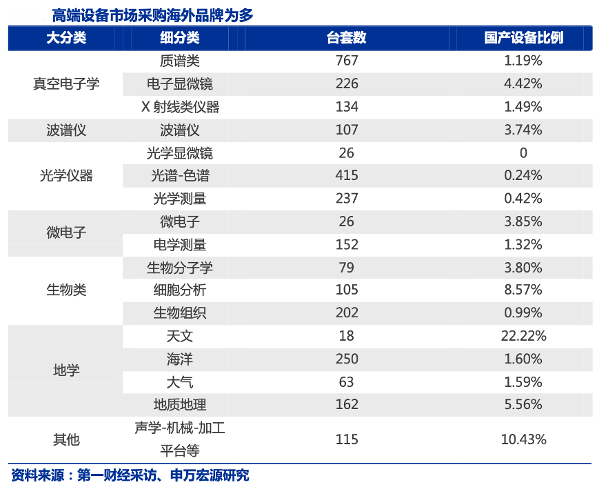 經(jīng)典案例:根據(jù)第一財經(jīng)采訪、申萬宏源研究等綜合資訊表明,中科院下屬研 究所 2016-2019 年間,采購的 200 萬以上的科學儀器中,質譜儀、X射線類儀器、光學色譜儀光學顯微鏡等國產(chǎn)設備比例不足1.5%,其中,光學顯微鏡國產(chǎn)采購率為0。國產(chǎn)科學儀器很少賣到 200 萬元以上,高端科學儀器依賴進口仍是當前中國科學儀器設備領域的主要 現(xiàn)狀。